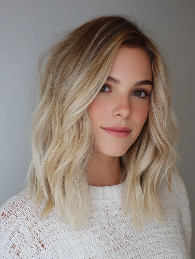 • Styling & Care: Style with loose, beachy waves using a curling wand. Use a texturizing spray to enhance the piece-y, lived-in vibe. A purple or blue shampoo can be used sparingly on the lightest ends to keep them bright.