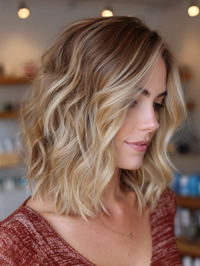 • Why It Works: The long bob (lob) is the perfect carrier for sun-kissed, seamless balayage. Darker roots melt into mid-length caramel and blonde ends, mimicking the natural lightening of summer. It’s relaxed, low-maintenance, and full of soft dimension.