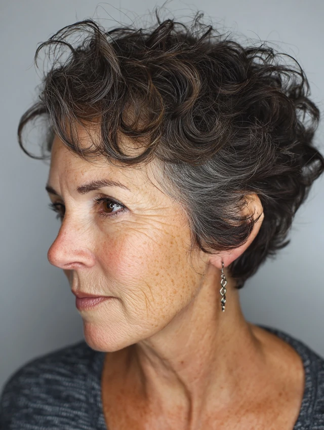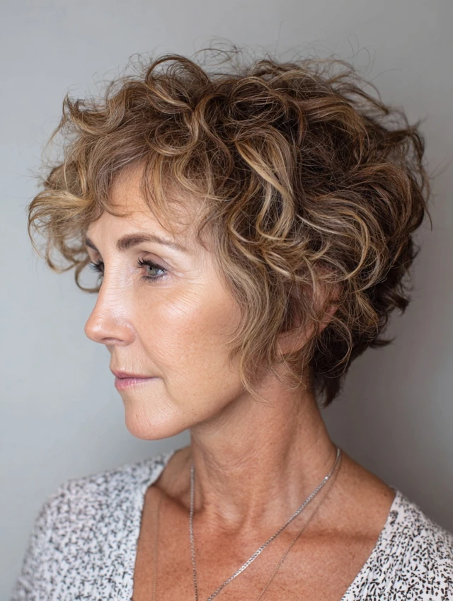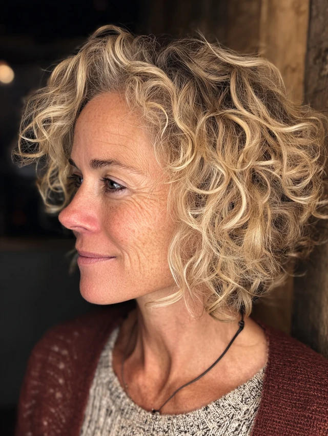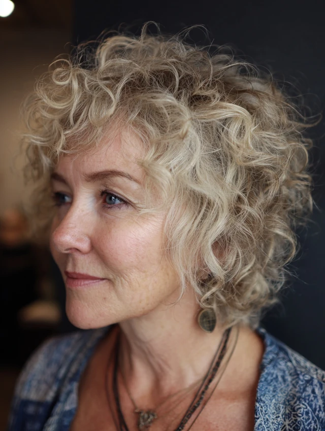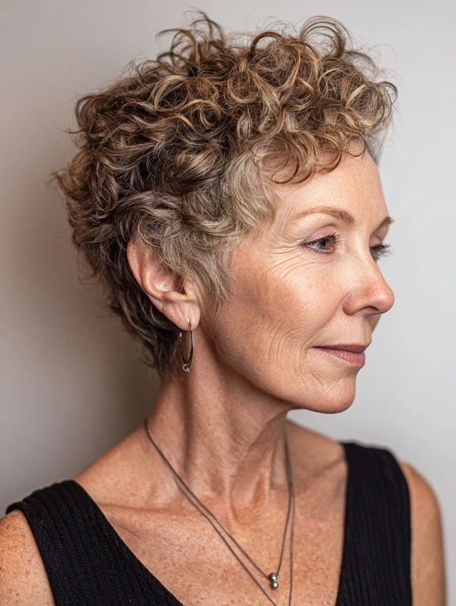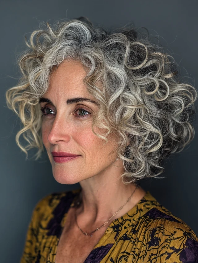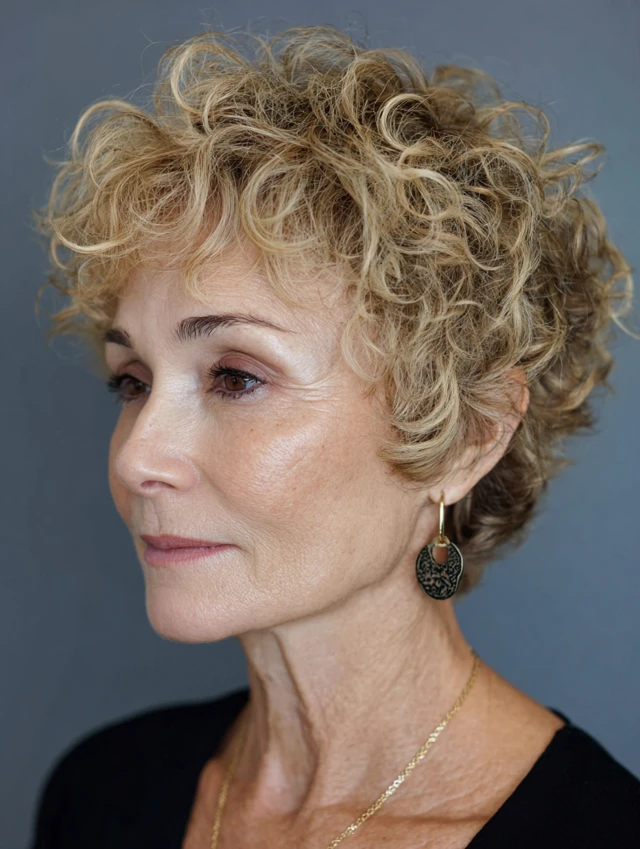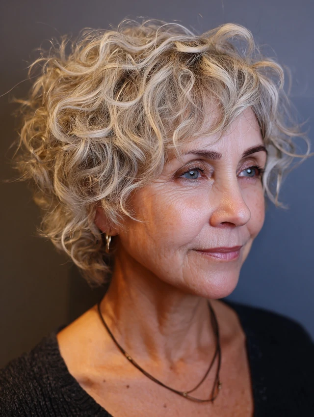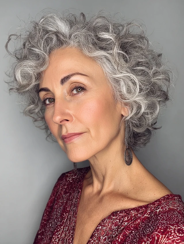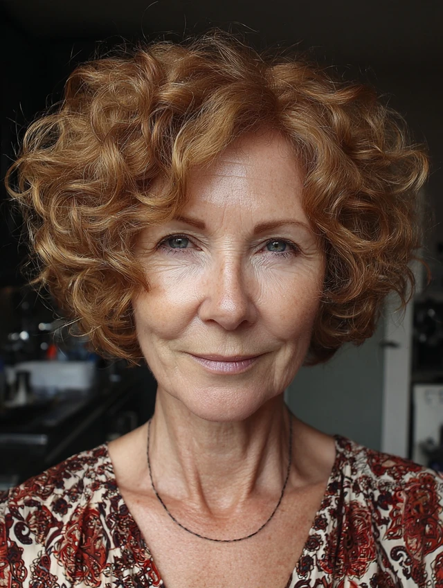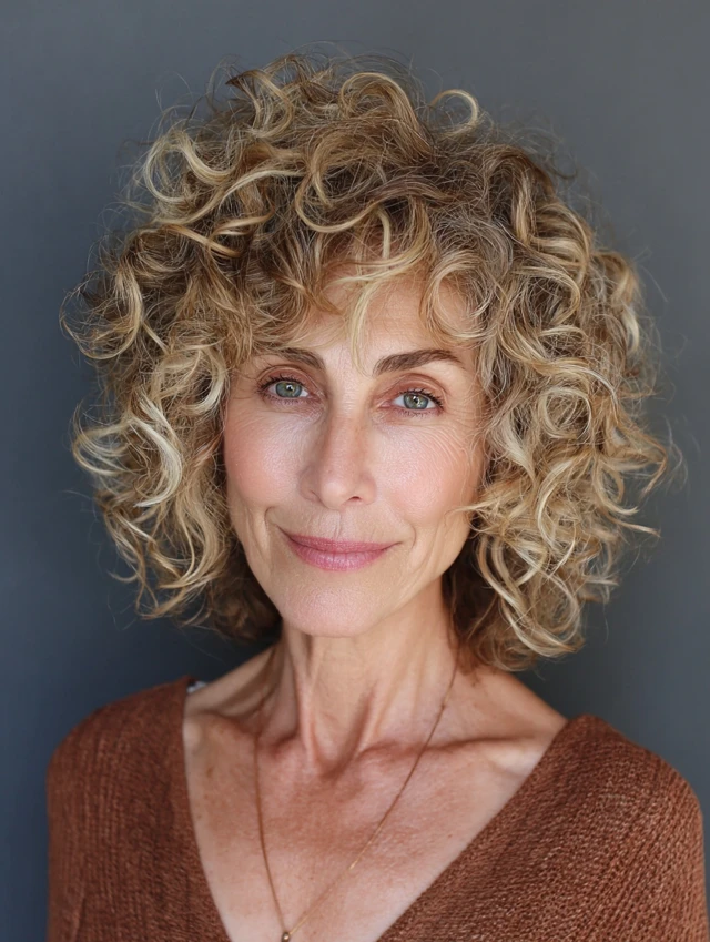 A chic, age-appropriate curly hairstyle that adds volume, highlights natural texture, and enhances facial features.